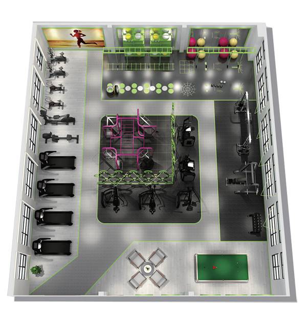 100-200平方米健身房器材套餐适合小区会所、酒店、企业单位、健身俱乐部等健身房采用,最多能满足18-20人同时健身。