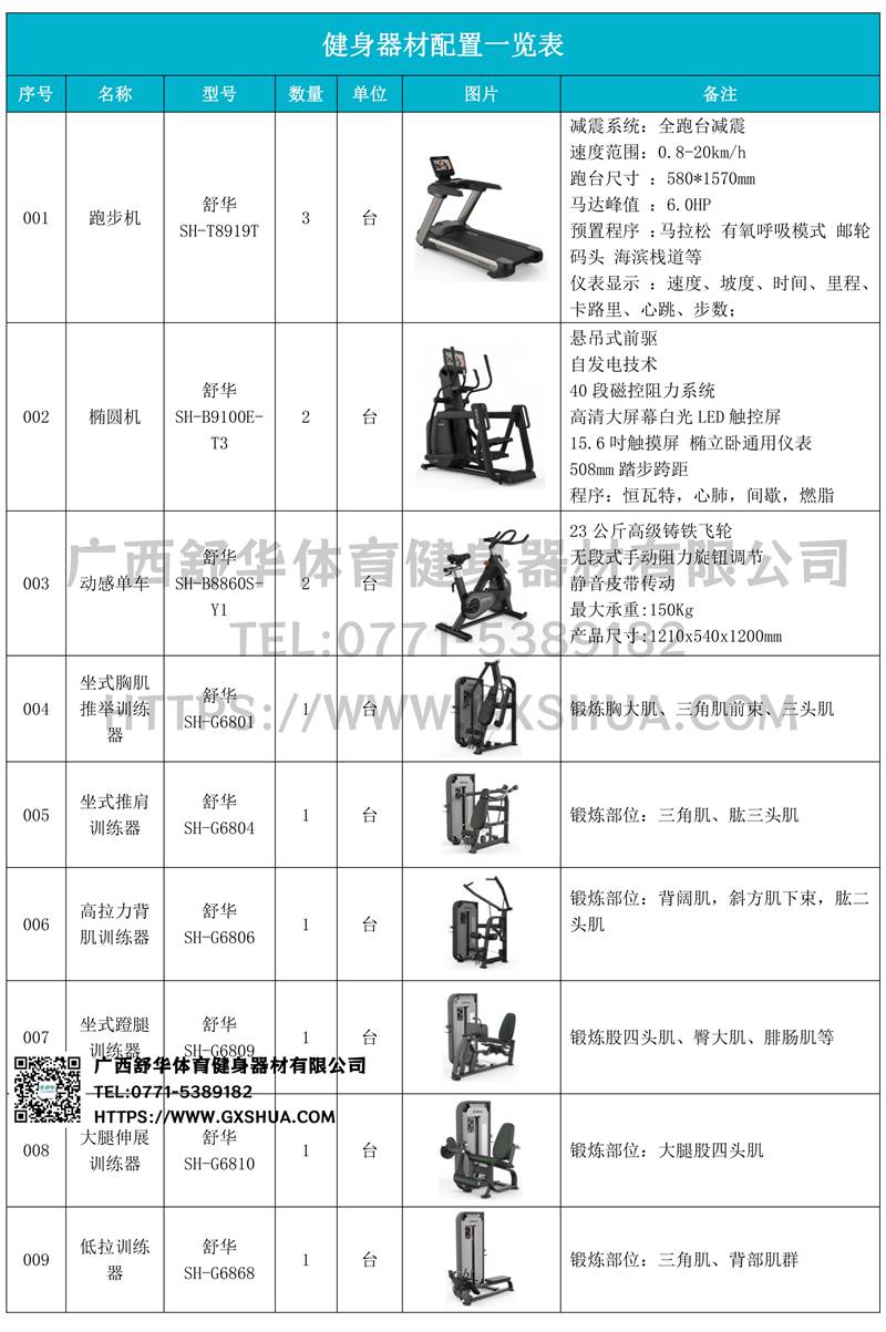 1.米兰V9+跑步机SH-T8919T*3台-V9+采用全跑台减震设计,为跑者提供舒适的落脚地感和稳定的跑步支撑,良好的缓冲防护,降低膝关节受伤风险。商用大跑台,为跑者提供从容奔跑空间,180kg承载力,580*1570纯跑台面积,满足专业健身需求。V9+采用F级商用马达,6HP峰值马力,20km/h最高速度,提供源源不断的动力。