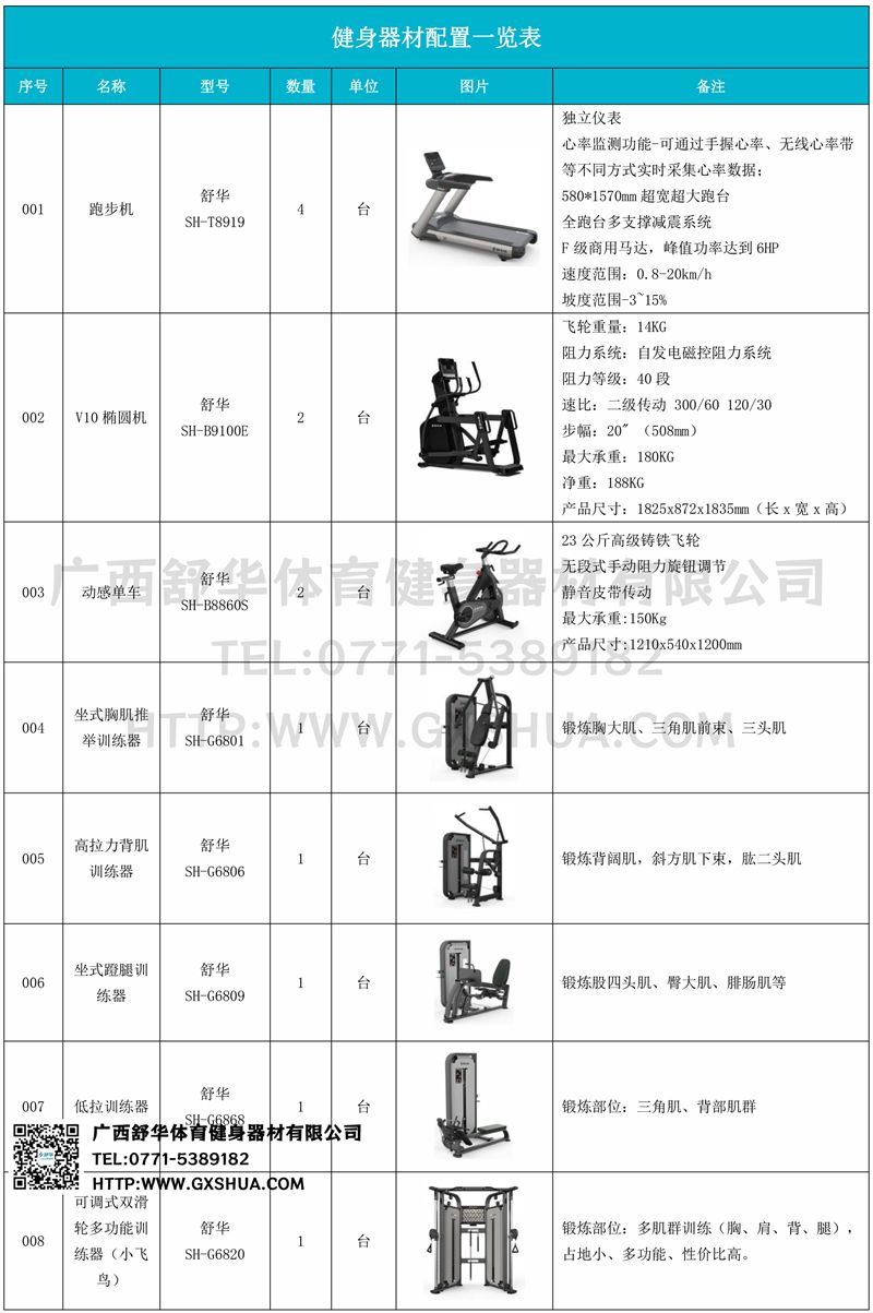1.米兰V9跑步机SH-T8919*4台-580*1570mm超宽超大跑台-跑感舒适,跑台整体安全稳定;全跑台多支撑减震平台,保证跑台超强支撑力,达到180kg支撑,满足专业健身房需求。F级商用马达-超强马达,AC 3.0HP 交流,峰值功率达到6HP,F级商用品质。速度范围达到0.8-20km/h;V9跑步机可实现跑台扬升功能,坡度范围-3~15%,满足客户不同的锻炼需求。
