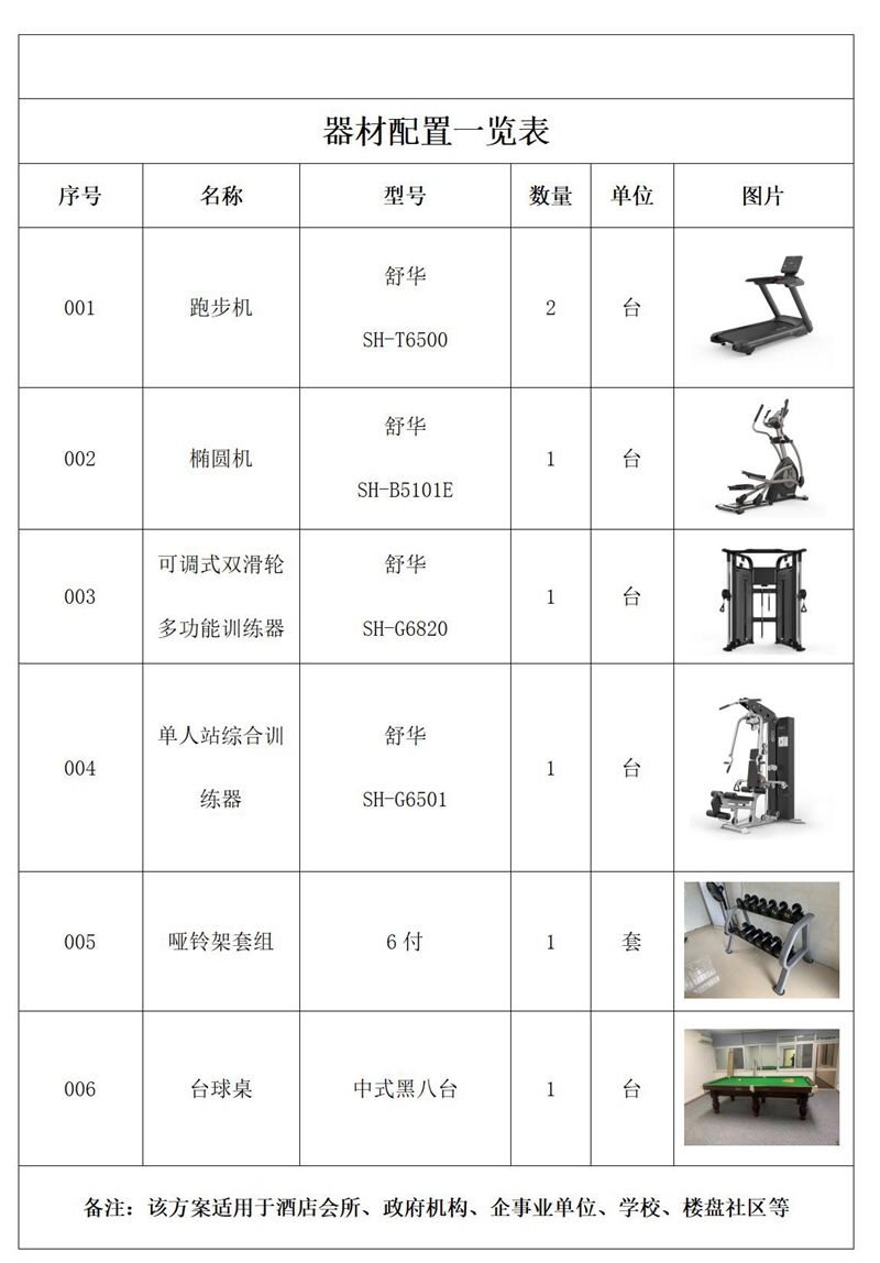 此方案要求面积小于30平米,我们会根据您个人的实际情况和场地面积而定。此方案推荐小型单位健身房、酒店会所健身房配置。能满足5-10人同时健身使用。