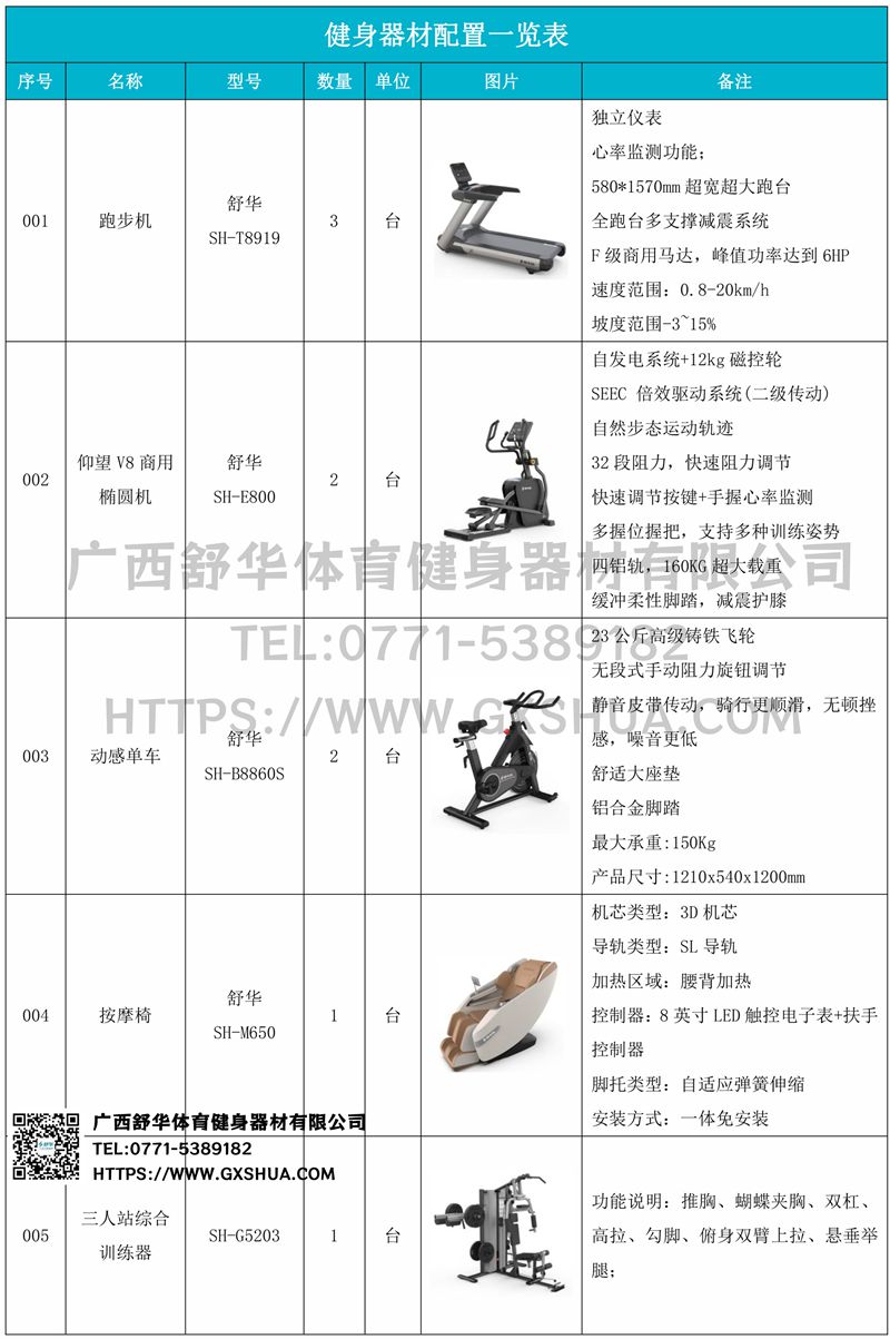 1.米兰V9跑步机SH-T8919*3台-F级商用马达-超强马达,AC 3.0HP 交流,峰值功率达到6HP,F级商用品质。速度范围达到0.8-20km/h;V9跑步机可实现跑台扬升功能,坡度范围-3~15%,满足客户不同的锻炼需求。