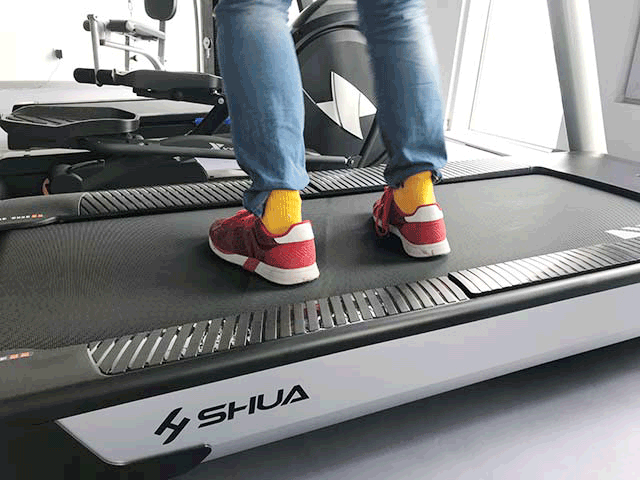 米兰x6跑步机减震方面采用6块内置高弹硅胶块,复检式双层加密跑板 。为了真实形象地体现减震效果如何,我们再次暴力登场。(如下图)小编同事体重180斤,在跑台上面往死里用力蹦跳,跑步机只有一些轻微的晃动。小编同事反馈,双脚完全没有疼痛感,反而感觉很有弹性。